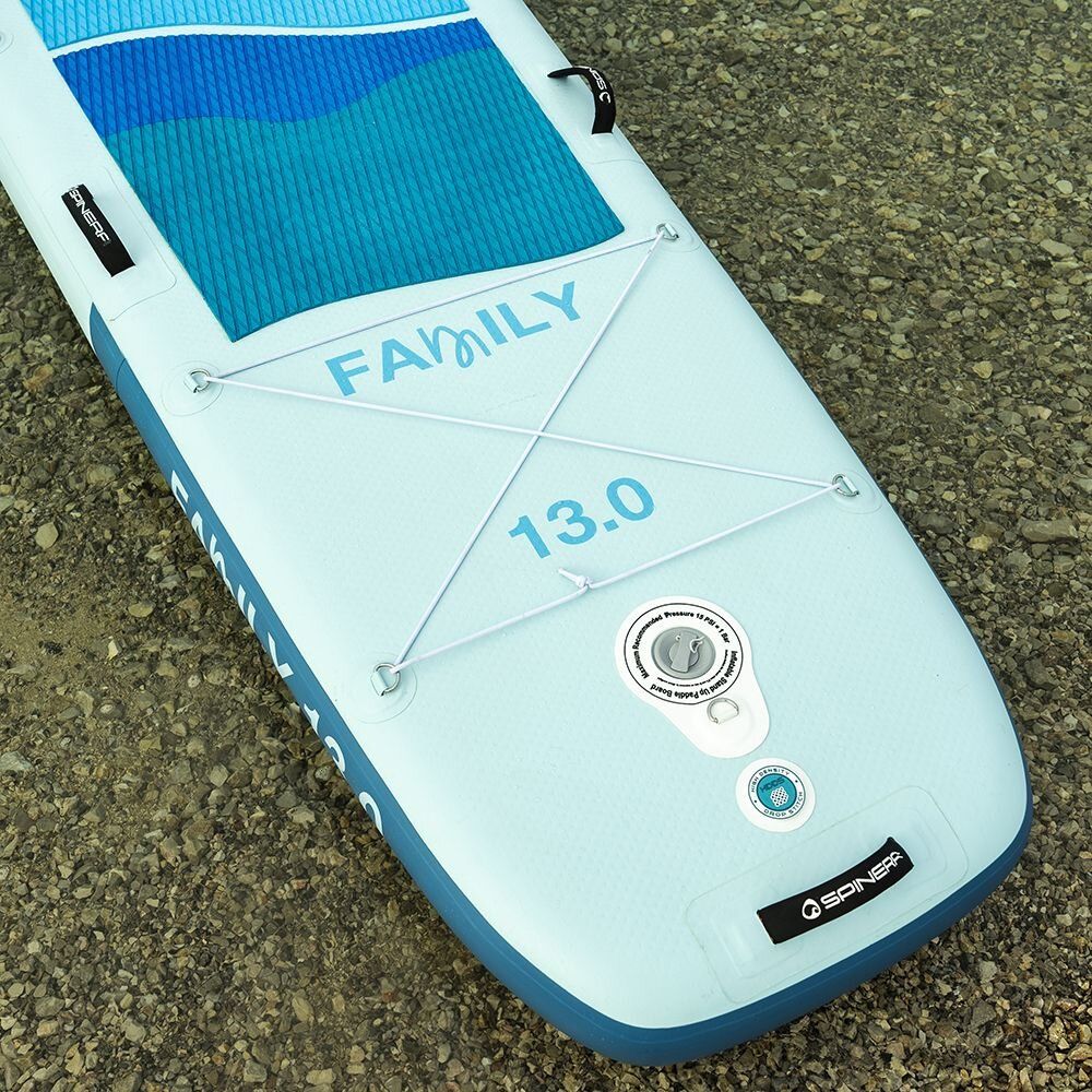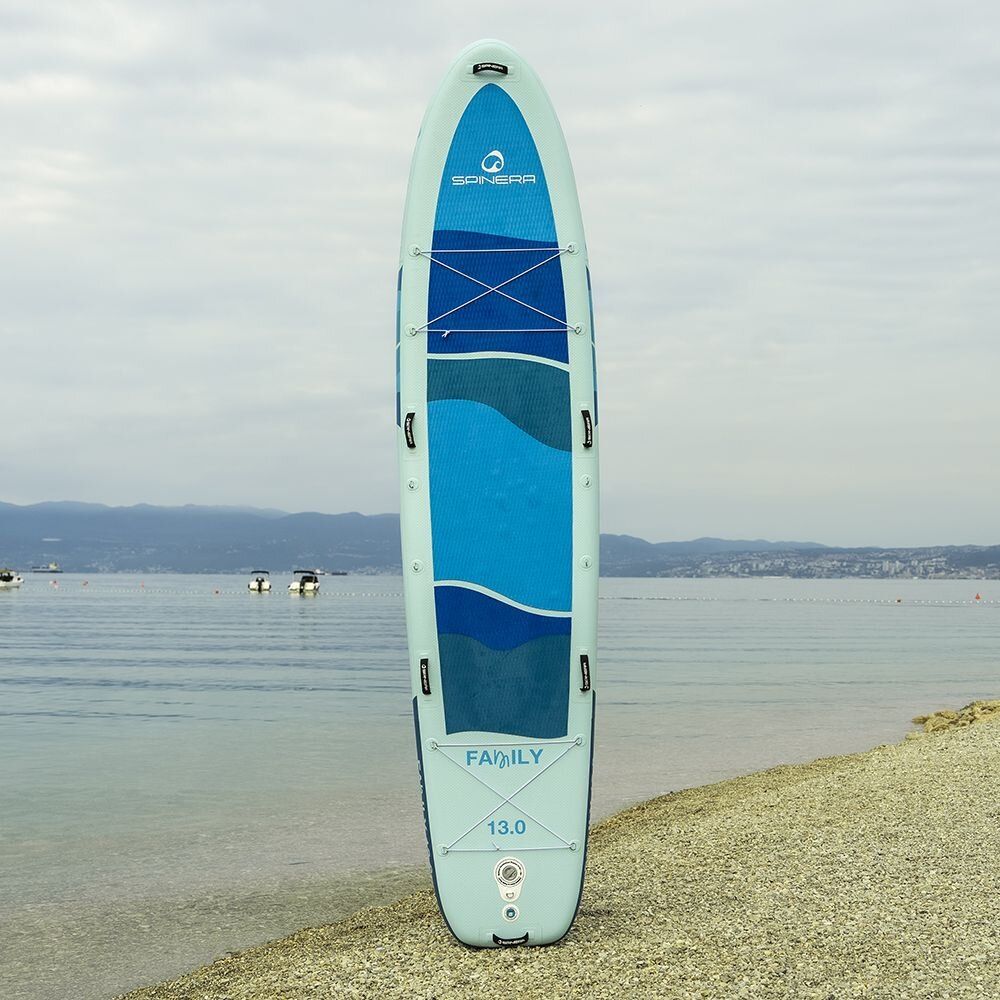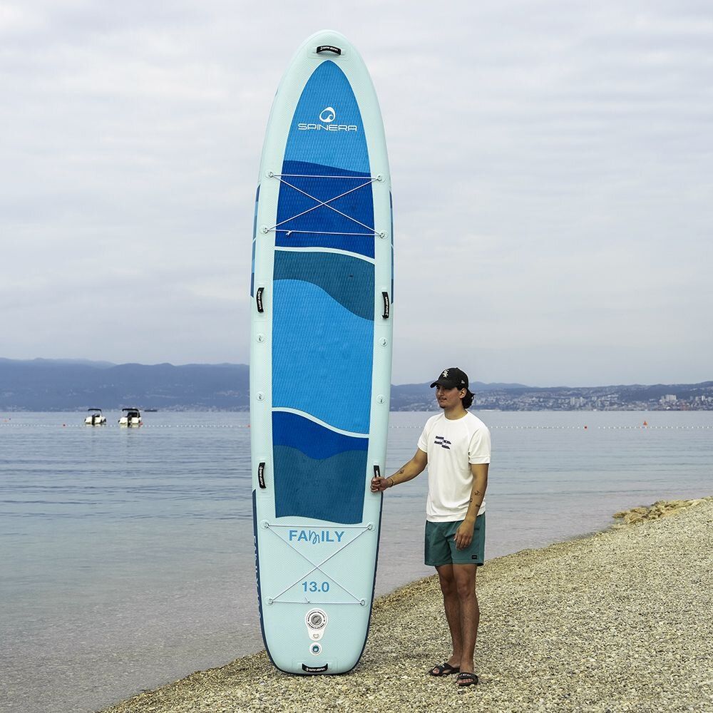 Paddleboard SPINERA Family 13' byl navržen s jediným cílem – nabídnout maximální prostor, stabilitu a jistotu pro společné chvíle na vodě. Díky délce téměř čtyř metrů a velkorysé šířce poskytuje pohodlnou palubu pro několik jezdců najednou, ať už vyrážíte na rodinný výlet s dětmi, víkendovou projížďku s přáteli nebo relaxační jízdu se psem. Široká konstrukce dodává paddleboardu výjimečnou stabilitu, která zůstává zachována i při pohybu více osob na palubě.