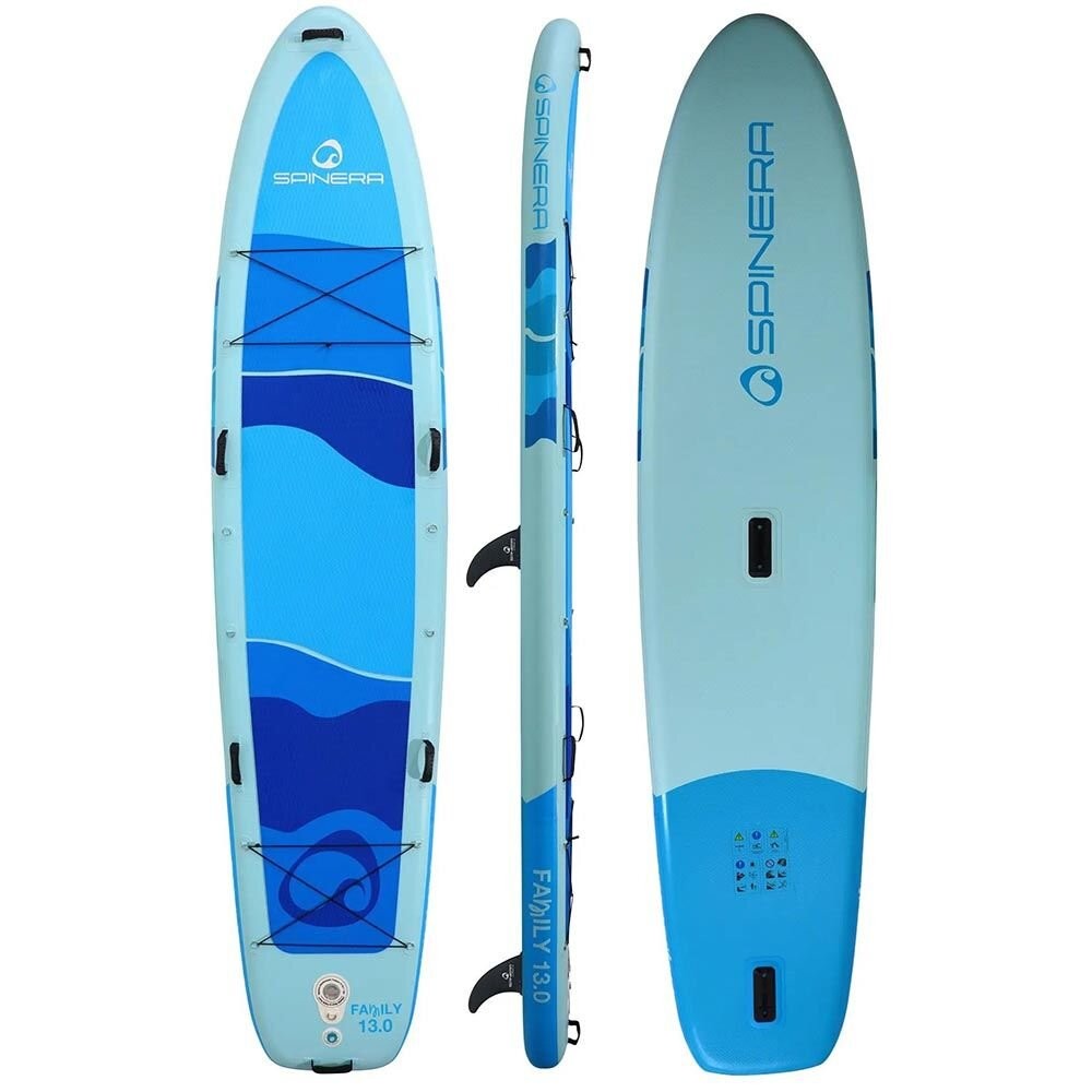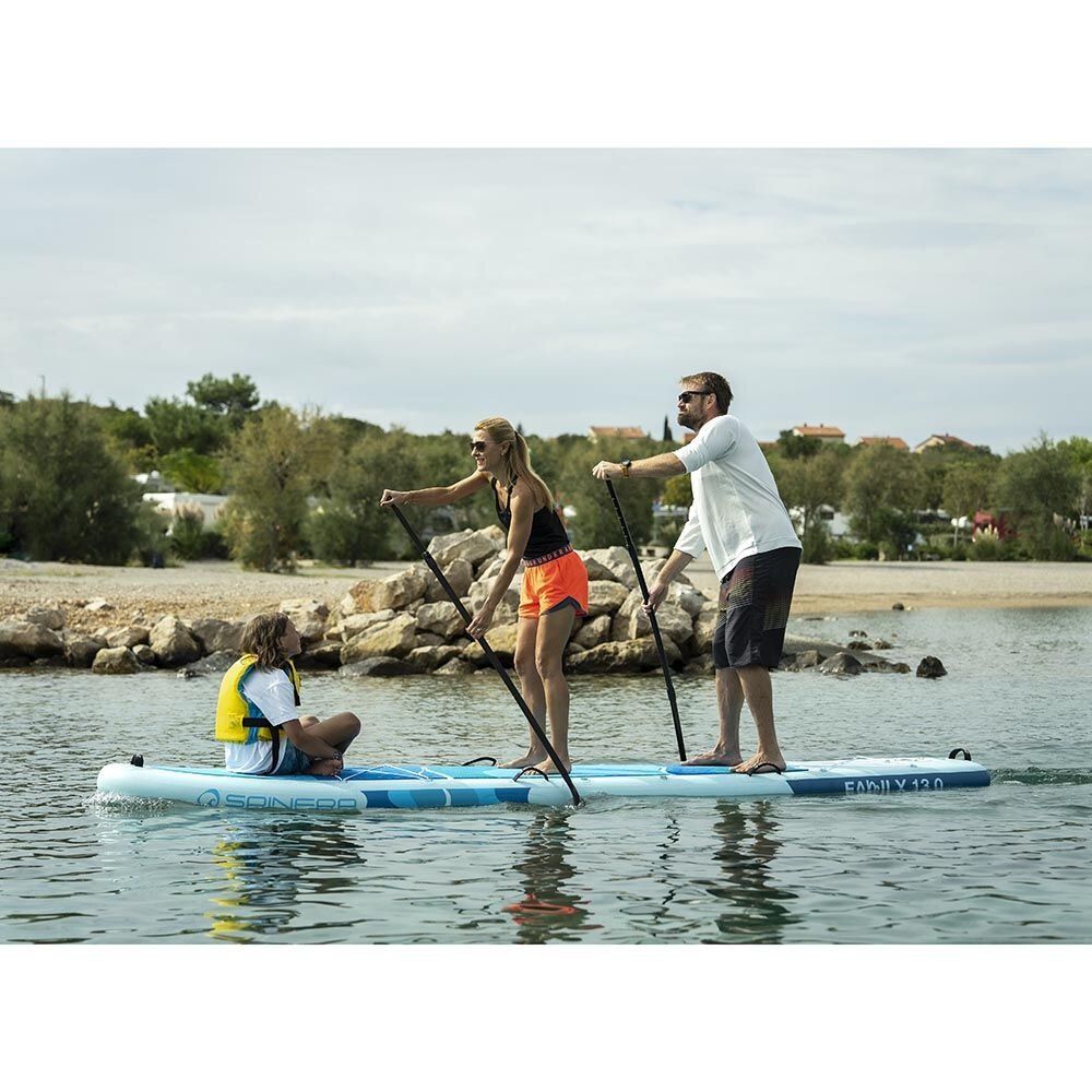 SPINERA Family 13' je ideální volbou pro rekreační a skupinový paddleboarding na jezerech, přehradách i klidnějších řekách, kde vynikne jeho vyváženost a komfort. Součástí balení je kompletní vybavení včetně dvou nastavitelných třídílných hliníkových pádel, dvojčinné ruční pumpy s manometrem pro rychlé nafouknutí, bezpečnostního leash, odnímatelných ploutví a praktického transportního batohu. Tento paddleboard je připraven stát se centrem rodinné zábavy a nezapomenutelných zážitků na vodě.