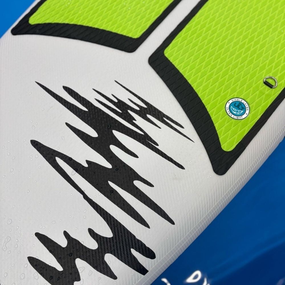 Promyšlený tvar s protáhlou špičkou zajišťuje hladký skluz a snadné vedení směru, zatímco velká šířka a stabilní záď dodávají paddleboardu výbornou rovnováhu, kterou ocení začátečníci i zkušenější jezdci při delších vyjížďkách. Paluba je vybavena kvalitní protiskluzovou EVA vrstvou s uzavřenou strukturou, která nabízí komfortní a bezpečný postoj a zároveň se velmi snadno čistí. Flexibilní upevňovací lanka na přídi umožňují vzít si s sebou osobní věci, vodu nebo menší výbavu na celý den.
