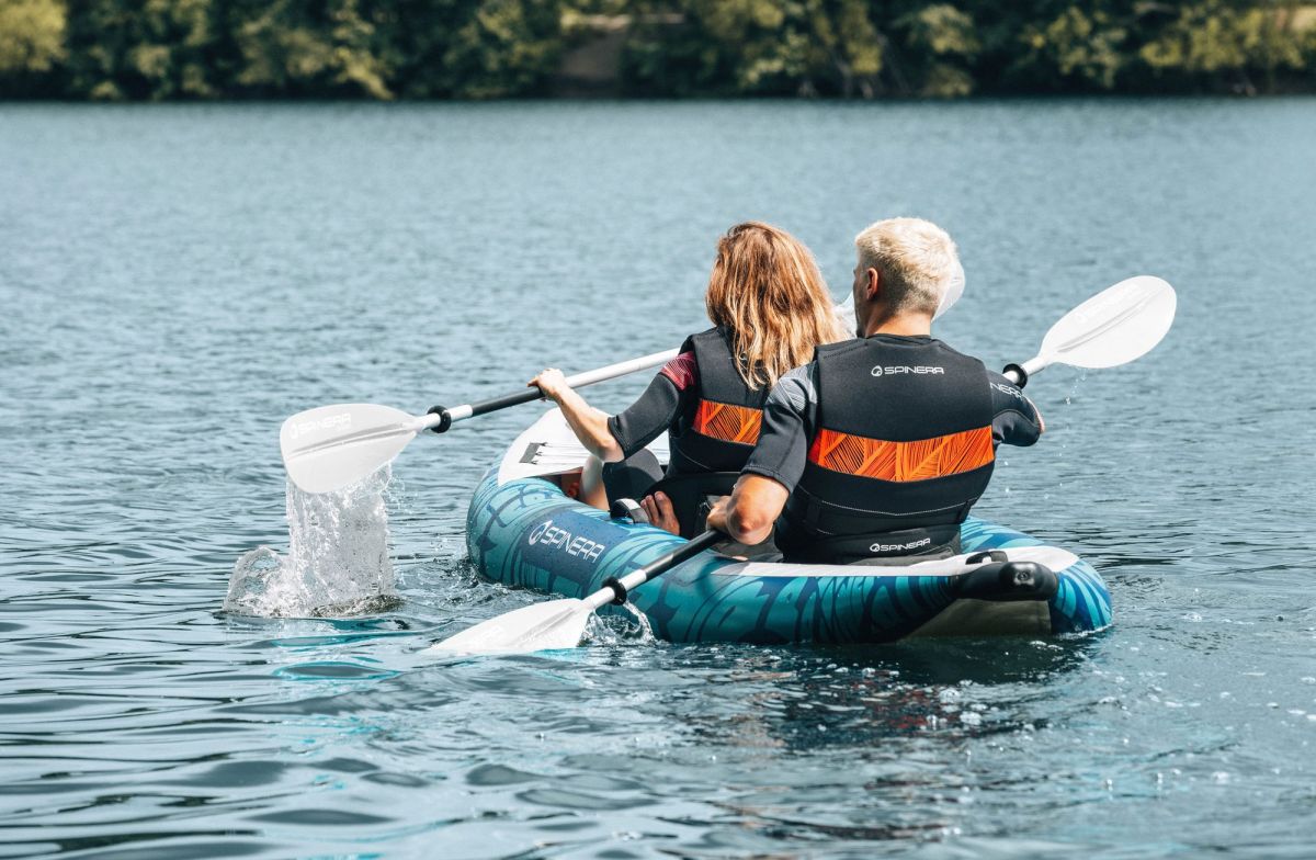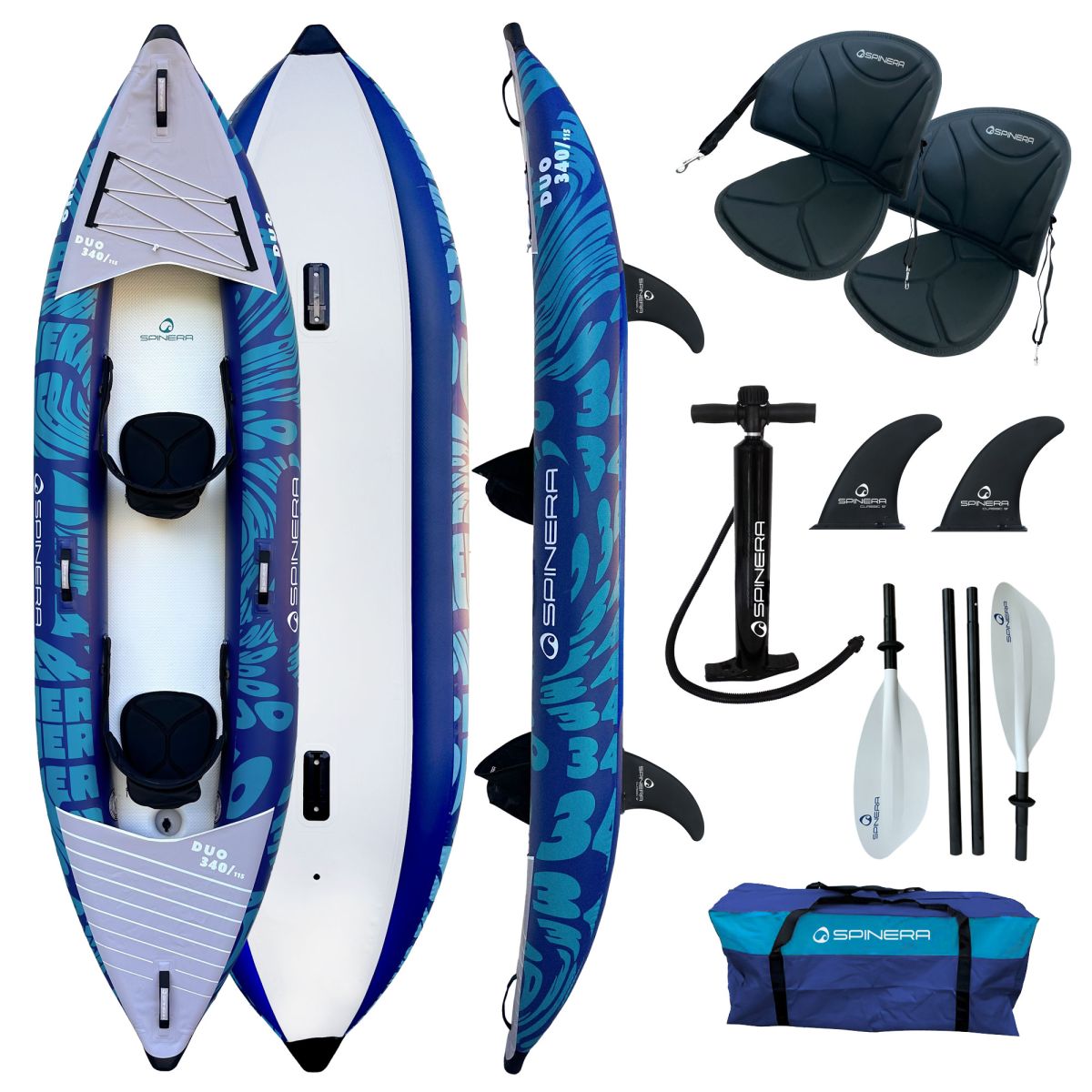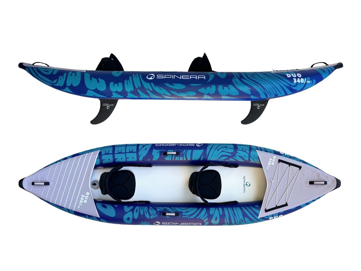 SPINERA Duo 340 je dodáván včetně dvou pádel, dvou sedaček, pumpy a transportní tašky. Díky nízké hmotnosti a skladným rozměrům po sbalení se snadno vejde do kufru běžného auta a je ideální volbou pro páry, rodiny i rekreační vodáky, kteří hledají spolehlivý dvoumístný kajak s nosností až 160 kg pro pohodové i delší vodní výpravy.