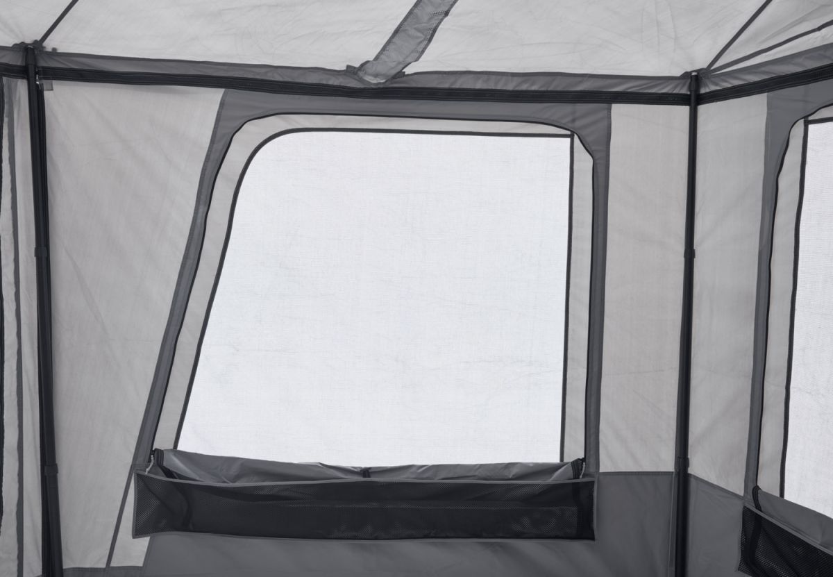 Plášť stanu je vyroben ze 100% recyklovaného polyesteru 600D s ripstop úpravou, který kombinuje vysokou odolnost vůči dešti, větru i mechanickému opotřebení s velmi dobrou prodyšností. Odnímatelná pláštěnka umožňuje přizpůsobit ochranu stanu aktuálnímu počasí a podpořit optimální cirkulaci vzduchu uvnitř. Interiér je navržen s důrazem na praktičnost a přehlednost, což dokládají integrované moskytiéry, chytré úložné kapsy a konstrukce, která dovoluje ponechat spacáky i polštáře uvnitř stanu i po jeho složení.