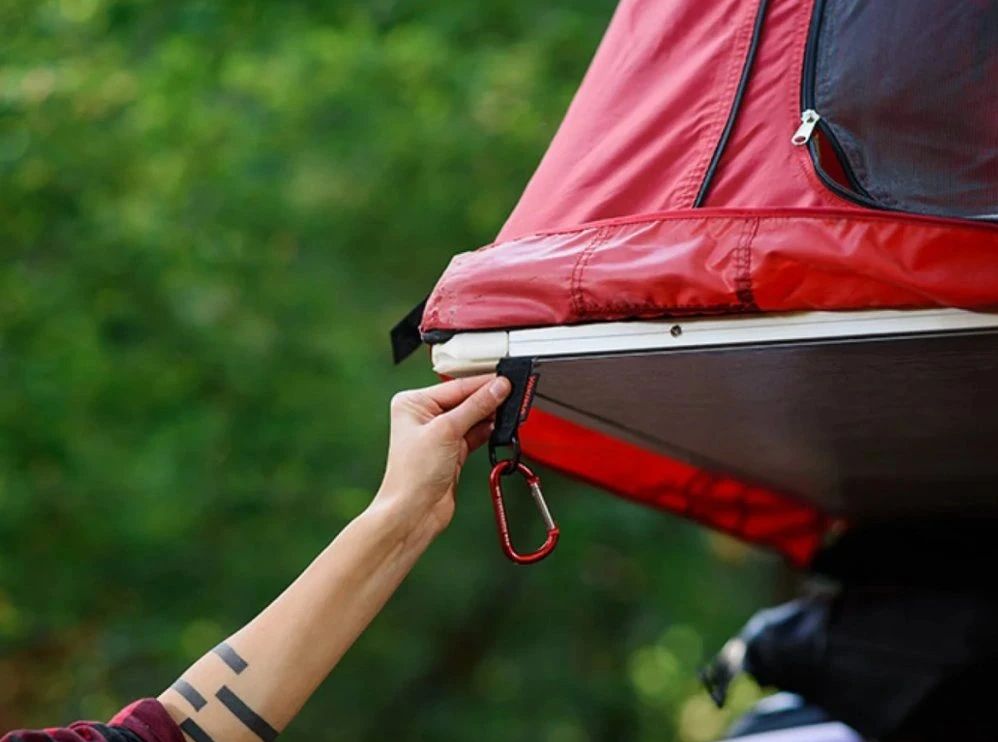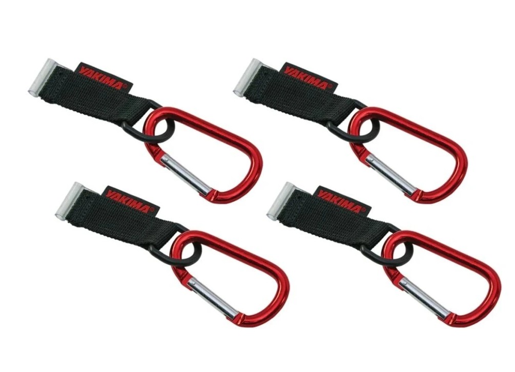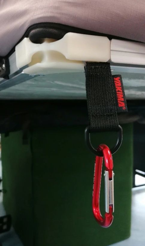 YAKIMA SkyRise SkyHooks jsou praktické karabinky na odolném nylonovém řemínku, které umožňují efektivně zavěsit všechny drobnosti, od bund a ručníků až po tašky nebo osvětlení, přímo ve střešním stanu.